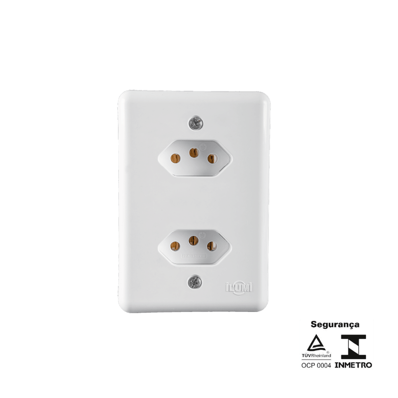 A linha de interruptores e tomadas da ilumi foi projetada com materiais resistentes e confiaveis. Os produtos foram submetidos a rigorosos testes de qualidade e segurança placa é resistente capaz de suportar até 750 °c tampa em nylon antichama capaz de suportar até 850c° e por fim os parafusos em aço antiferrugem características técnicas: cor: branca tomada: dupla pinos: 2pinos + terra amperagem: 20a tensão: 250v placa: abs suporte e tampa: nylon antichama contatos: latão, parafusos: aço certificação compulsória: sim normas: nbr nm 60884 1 e nbr 14136..