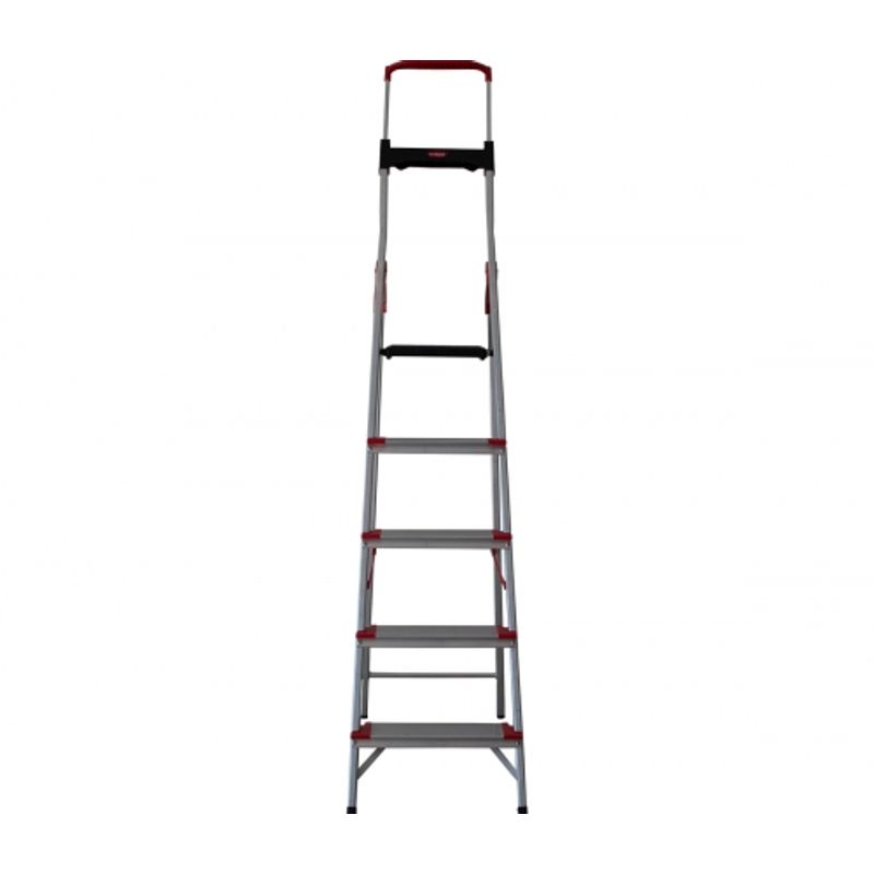 Escada dobravel 5 degraus confort em aluminio alumasa . Escada confort 5 degraus .seus degraus com 13 cm de base, quase o dobro das escadas residenciais, fazem da escada comfort sinônimo de conforto e segurança. Além dos degraus super largos, ela tem uma bandeja no topo com diversos encaixes para ferramentas e peças, gancho para pendurar baldes e um vão côncavo para lâmpadas não rolarem e caírem. .