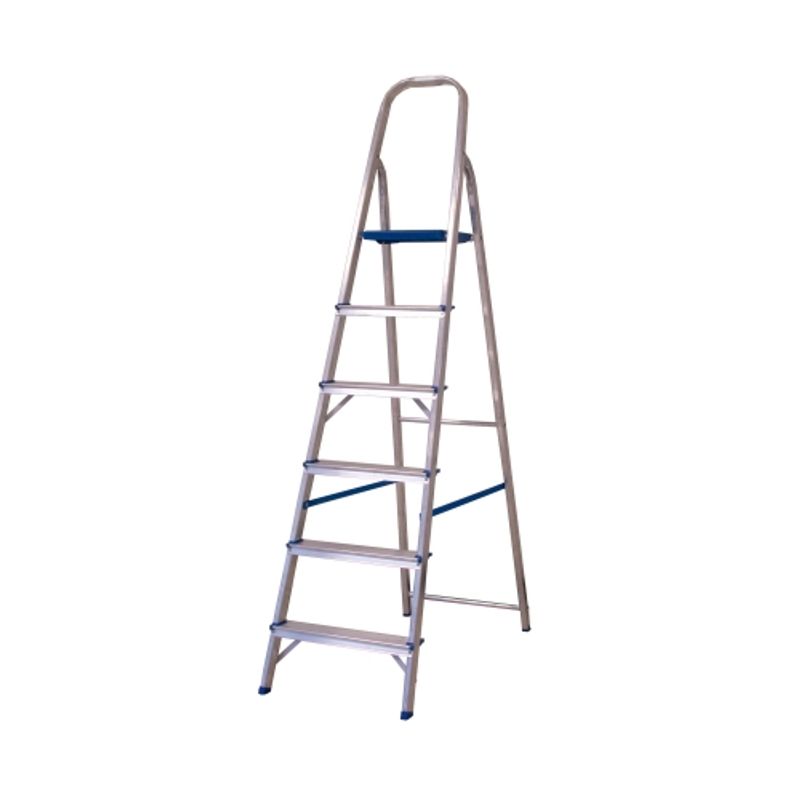 A escada possui uma estrutura em alumínio, o que garante resistência e leveza. Quando fechada, a escada tem 1,86 cm de comprimento, facilitando o armazenamento, e, ao ser aberta, atinge 1,30 cm, o que a torna ideal para uso em espaços residenciais. Ela tem 6 degraus, proporcionando um alcance eficiente e confortável, e pode ser dobrada, o que facilita o transporte e armazenamento..