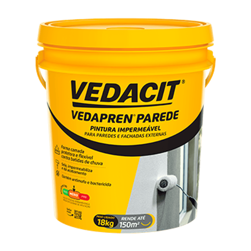 VEDACIT VEDAPREN PAREDE* é uma pintura impermeável e elástica que protege as paredes contra fissuras e batidas de chuva, além de ter alta durabilidade. Pode ser aplicado sobre reboco, concreto, fibrocimento e tingido com corantes líquidos base água até o limite estabelecido pelo fabricante de corantes.