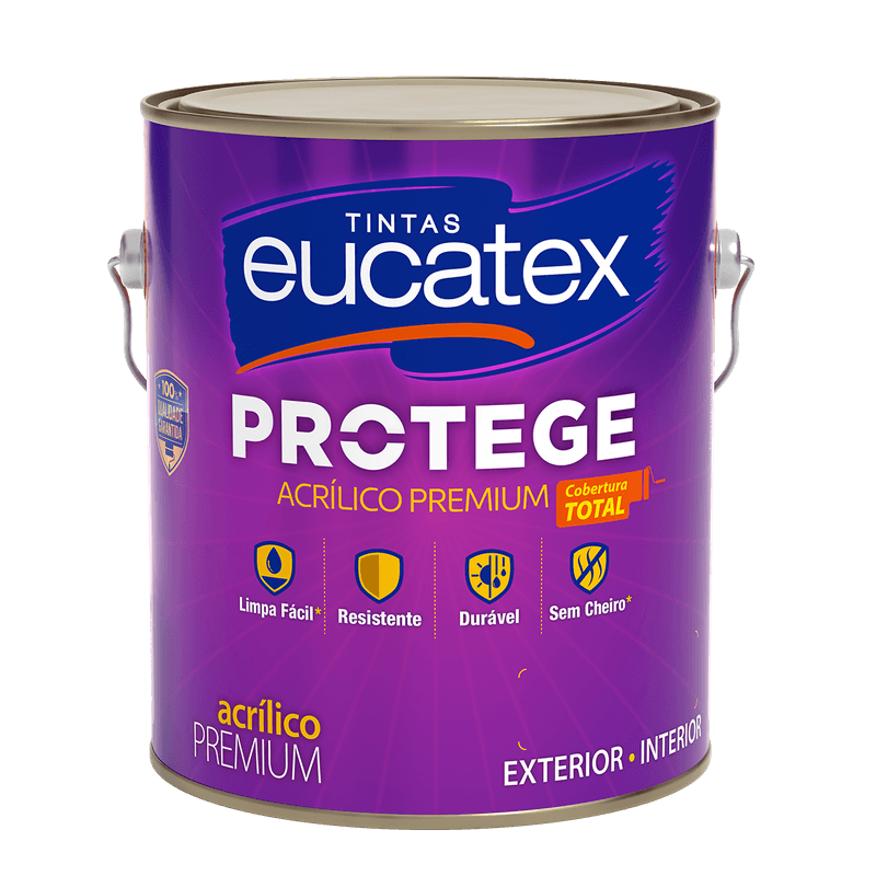 Tinta Acrílica Eucatex Protege Premium Fosco 3,6L Eucatex Acrílico Premium Sem Cheiro é uma tinta de alta performance para quem busca melhor desempenho e maior durabilidade e rendimento em pinturas de áreas externas e internas. De fácil aplicação, oferece ótima cobertura, baixo respingamento, é resistente às intempéries, tem excelente alastramento e ótimo acabamento. É indicada para superfícies externas e internas de reboco, massa acrílica, texturas, concreto, fibrocimento, repinturas sobre PVA e acrílico e superfícies internas de massa corrida e gesso. Uso exterior e interior..