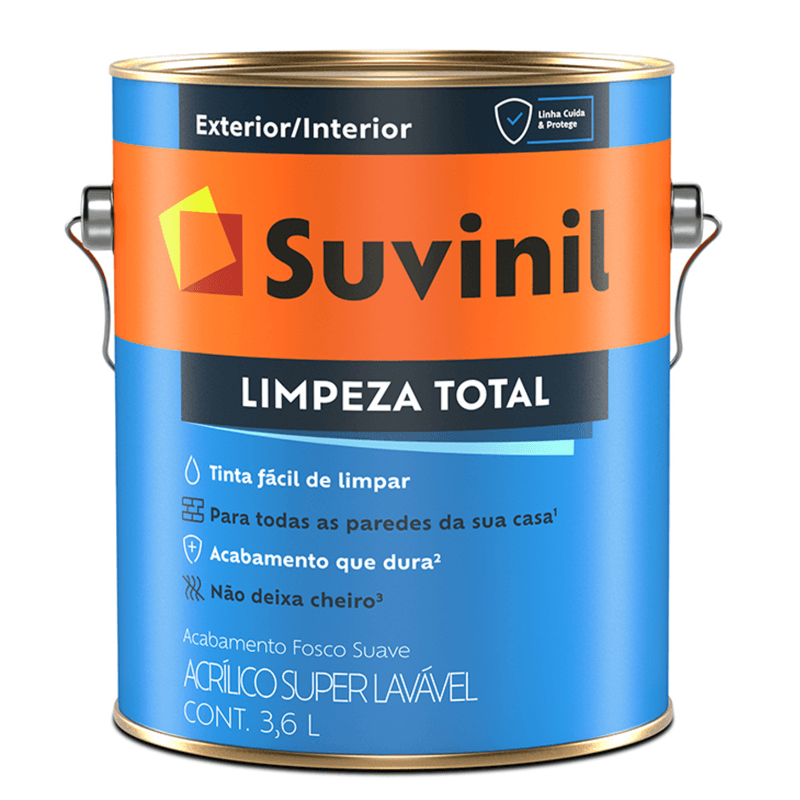 A tinta Suvinil Limpeza Total combina o acabamento fosco suave com facilidade de limpeza. É o melhor de dois mundos com uma tinta durável, que disfarça pequenas imperfeições na parede e pode ser aplicada tanto em ambientes externos quanto internos..