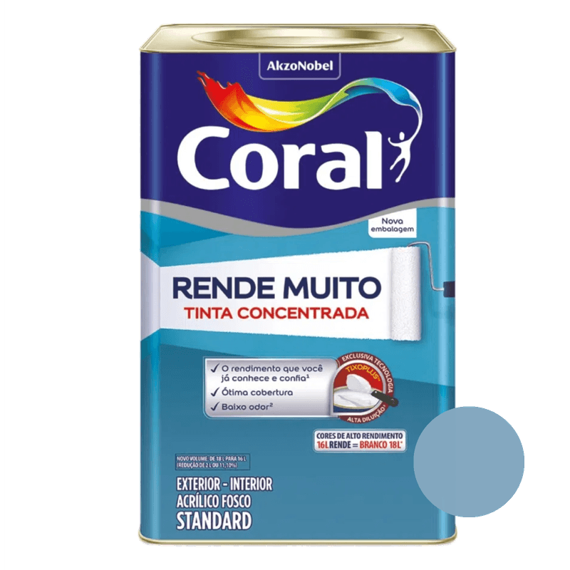 A Coral Rende Muito contém resinas acrílicas em sua composição, que a torna resistente à água, podendo ser utilizada na pintura de cozinhas, banheiros, lavanderias e paredes externas. Tinta super concentrada, com alta cobertura, além de ter baixo odor e máximo rendimento. Durabilidade de 2 a 3 anos em superfícies internas e externas..