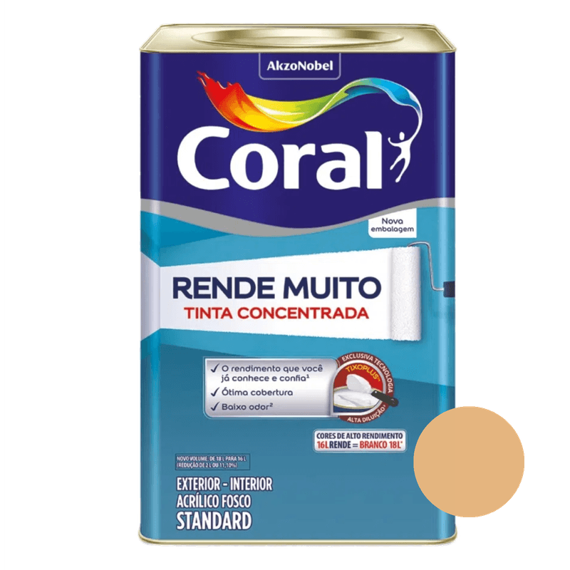 A Coral Rende Muito contém resinas acrílicas em sua composição, que a torna resistente à água, podendo ser utilizada na pintura de cozinhas, banheiros, lavanderias e paredes externas. Tinta super concentrada, com alta cobertura, além de ter baixo odor e máximo rendimento. Durabilidade de 2 a 3 anos em superfícies internas e externas..