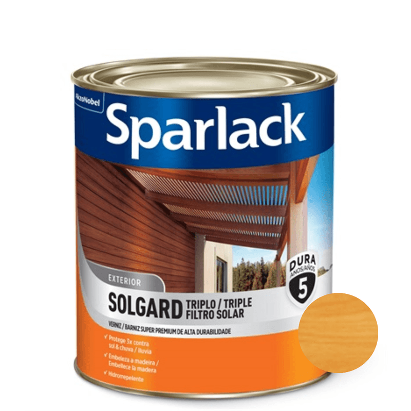 Solgard Triplo Filtro Solar é um Verniz Super Premium de alta durabilidade. Tripla proteção contra sol e chuva. Durabilidade de 5 anos. Acabamentos: Brilhante e acetinado. Inibe a penetração de raios solares, protege e embeleza a superfície. Para exterior: Portas, portões e janelas. Apresenta alto rendimento, alta espessura, secagem rápida, bom alastramento e boa dureza. Utilizar pincel, rolo, trincha ou pistola convencional. 3 demãos. Diluir com Aguarrás: 20% na primeira demão (não aplicar sem diluição) e até 10% nas demais para aplicação com pincel, rolo ou trincha, ou 15% nas demais para aplicação com pistola. Não diluí-lo com percentuais maiores do que os recomendados. Secagem Ao toque: 2 horas / Entre demãos: 12 horas / Completa: 24 horas Rendimento Galão 3,6L: até 66 m²/demão.